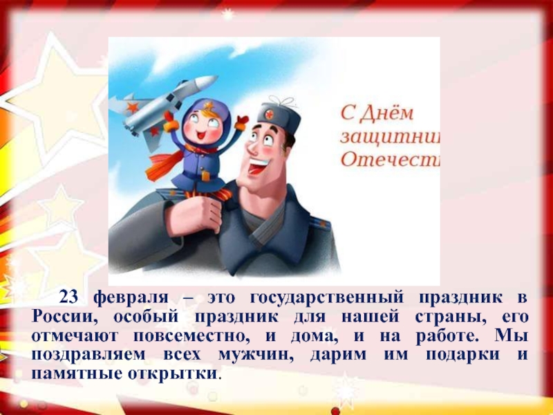 нашей страны, его отмечают повсеместно, и дома, и на работе. Мы поздравляем всех мужчин, дарим им подарки и памятные открытки.