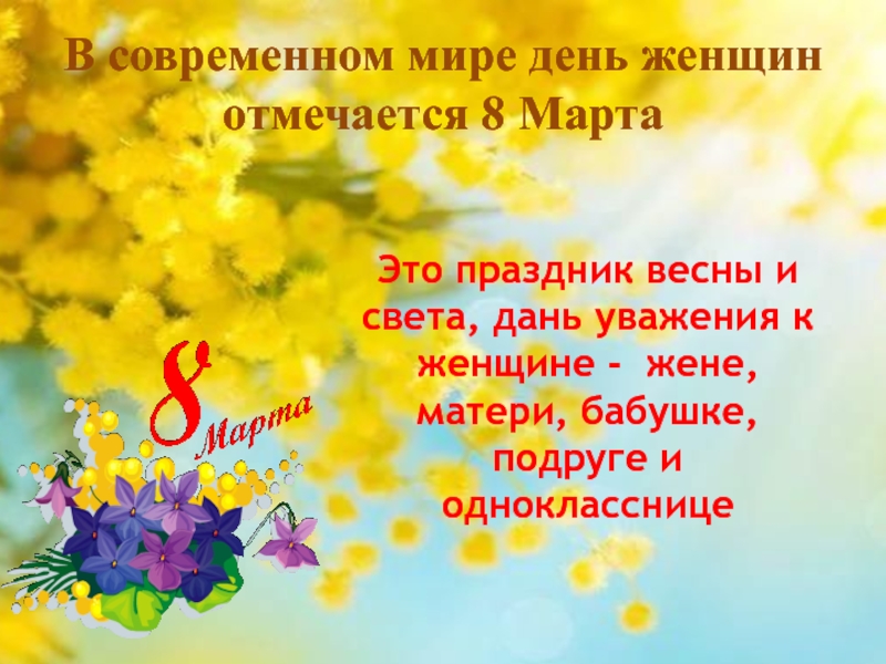 Слайд 16В современном мире день женщин отмечается 8 Марта