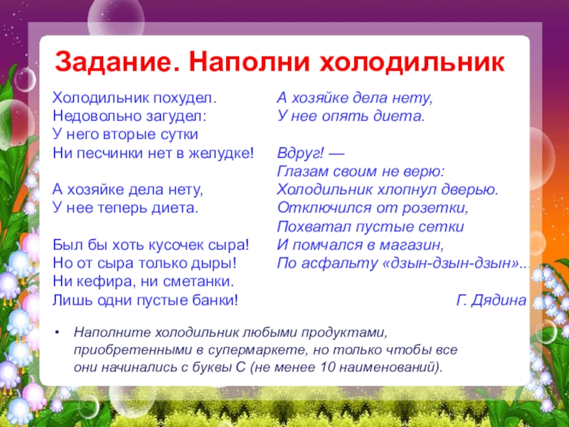 Наполните холодильник любыми продуктами, приобретенными в супермаркете, но только чтобы все они начинались с буквы С (не менее 10 наименований).
