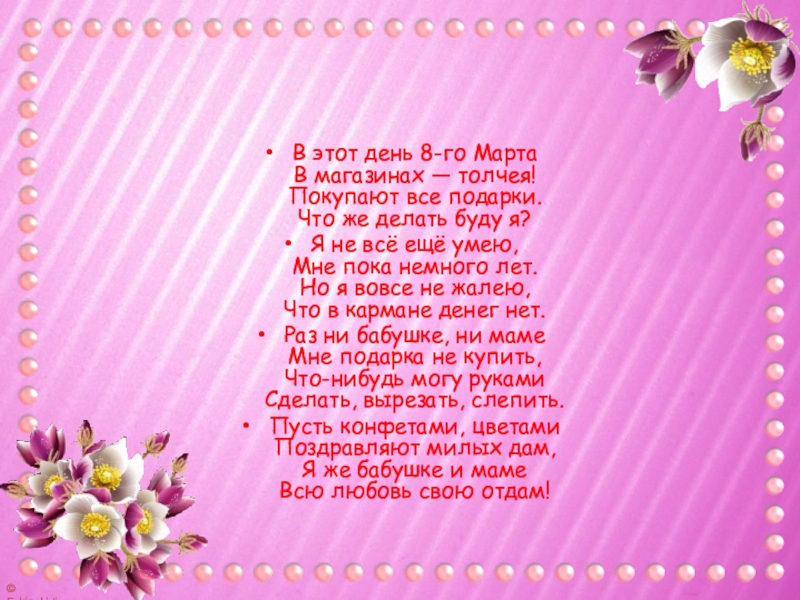 В этот день 8-го Марта В магазинах — толчея! Покупают все подарки. Что же делать буду я?Я