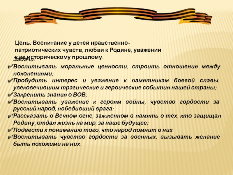 Цель: Воспитание у детей нравственно-патриотических чувств, любви к Родине, уважении к ее историческому прошлому.