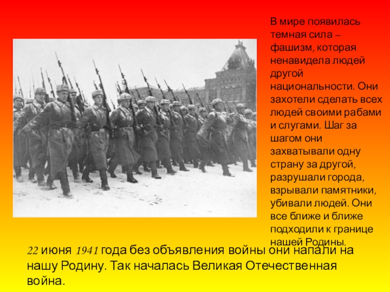 22 июня 1941 года без объявления войны они напали на нашу Родину. Так началась Великая Отечественная война.