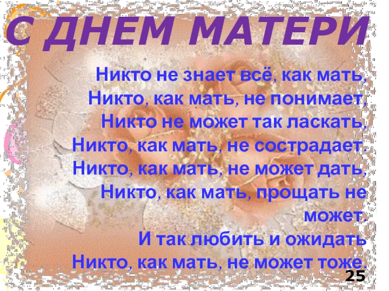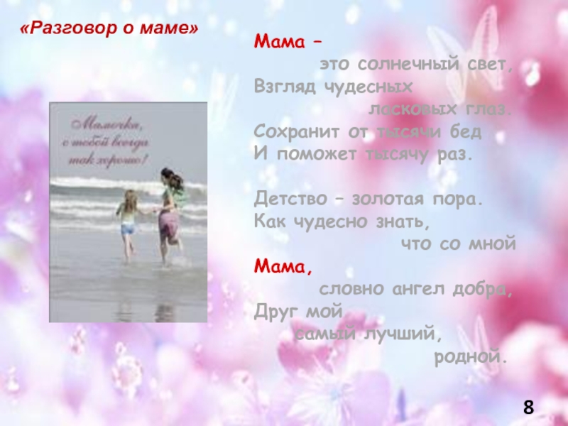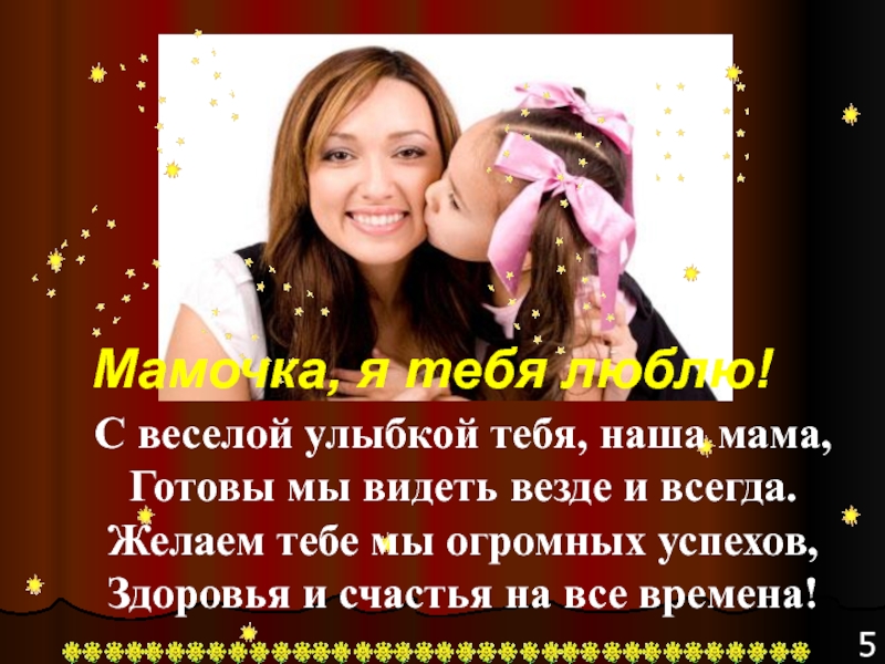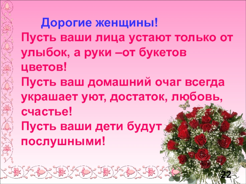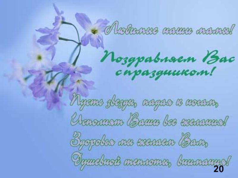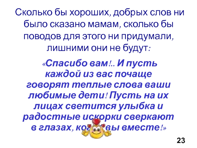 «Спасибо вам!.. И пусть каждой из вас почаще говорят теплые слова ваши любимые дети! Пусть на их лицах светится улыбка и радостные искорки сверкают в глазах, когда вы вместе!»