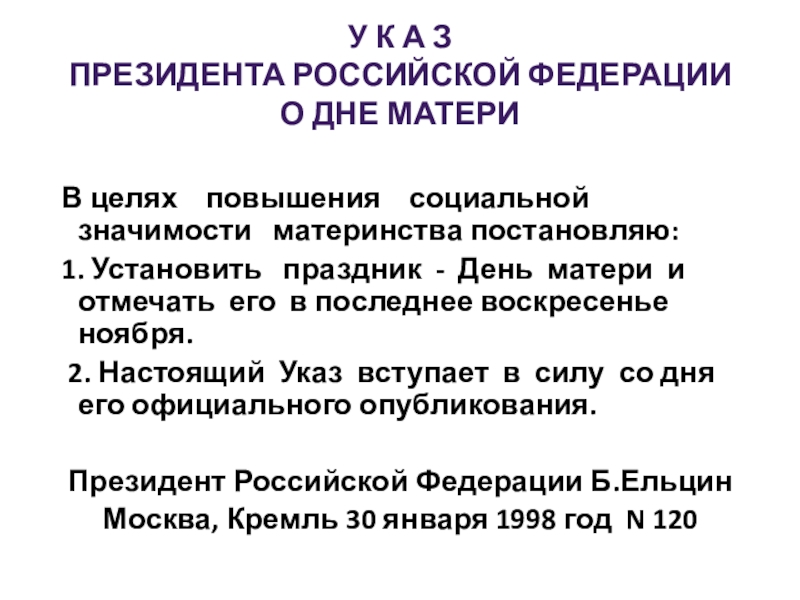 У К А З ПРЕЗИДЕНТА РОССИЙСКОЙ ФЕДЕРАЦИИ О ДНЕ МАТЕРИ В целях повышения социальной значимости материнства постановляю: 1. Установить праздник - День матери и отмечать его в последнее воскресенье ноября.