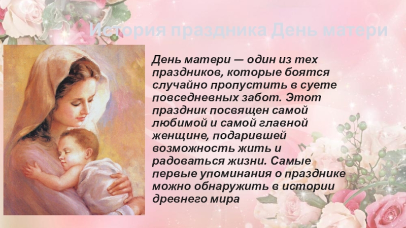 История праздника День матери День матери — один из тех праздников, которые боятся случайно пропустить в суете