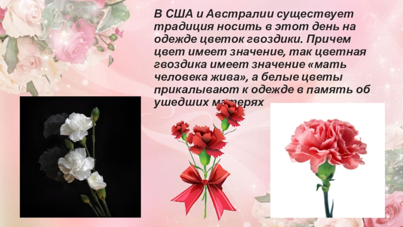 В США и Австралии существует традиция носить в этот день на одежде цветок гвоздики. Причем цвет