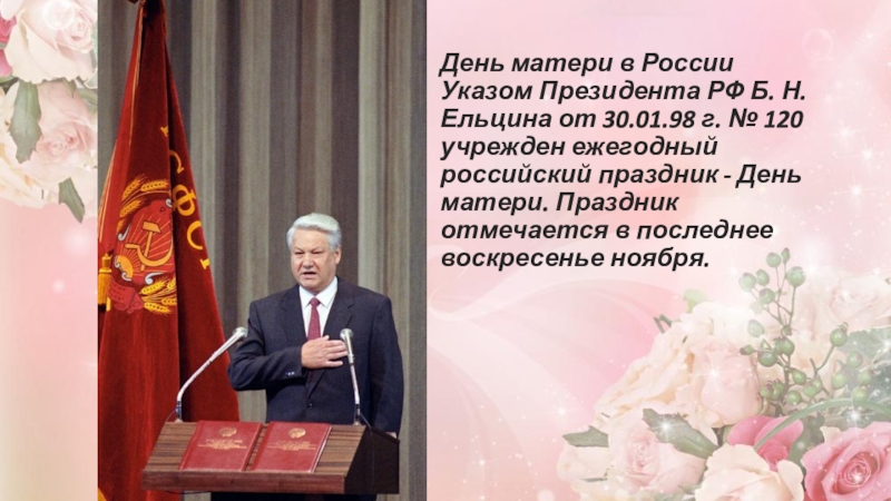 День матери в России Указом Президента РФ Б. Н. Ельцина от 30.01.98 г. № 120 учрежден