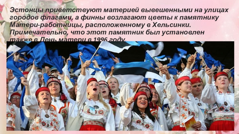 Эстонцы приветствуют материей вывешенными на улицах городов флагами, а финны возлагают цветы к памятнику Матери-работницы, расположенному