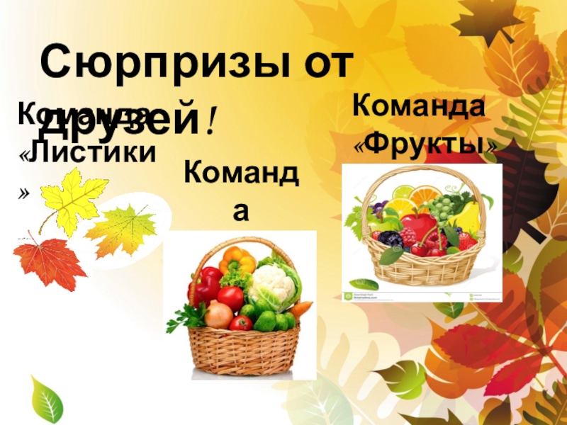 Сюрпризы от друзей!Команда «Овощи»Команда «Фрукты»Команда «Листики»