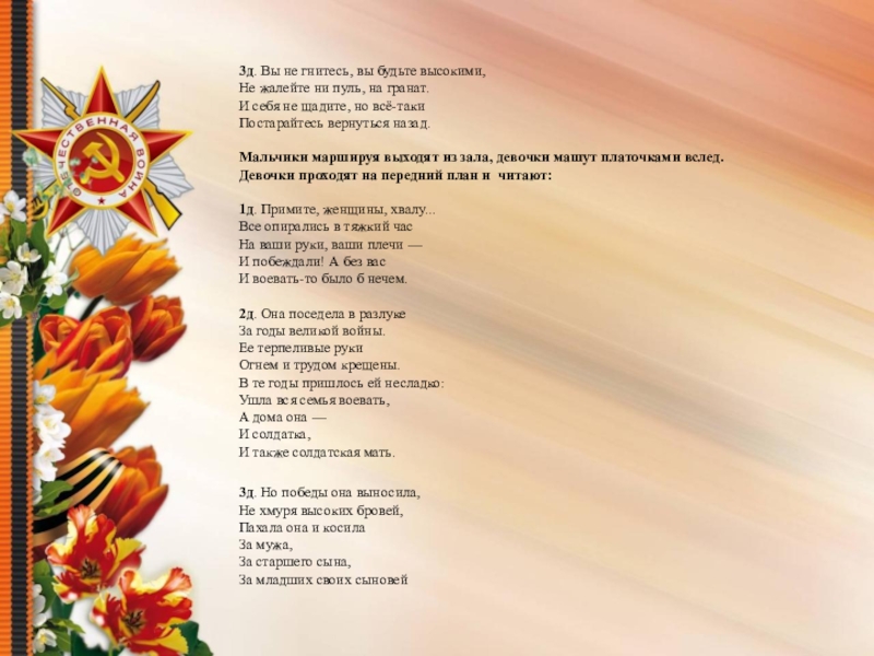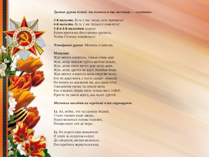 Звучит музыка. Вторая группа детей: три девочки окружают мальчика — «солдата», дают ему теплые носки, перчатки, вышитый кисет.