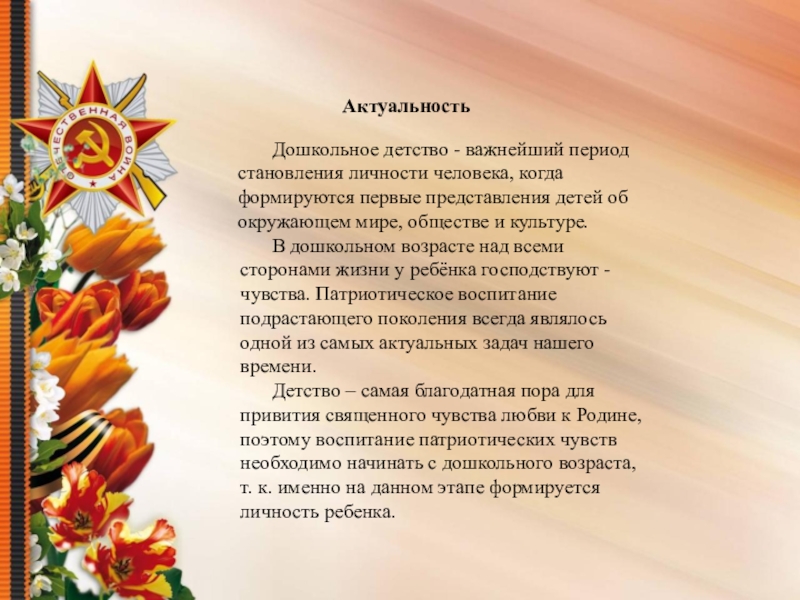 Детство – самая благодатная пора для привития священного чувства любви к Родине, поэтому воспитание патриотических чувств необходимо начинать с дошкольного возраста, т. к. именно на данном этапе формируется личность ребенка.