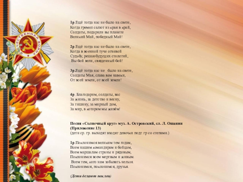 Песня «Солнечный круг» муз. А. Островский, сл. Л. Ошанин (Приложение 13)