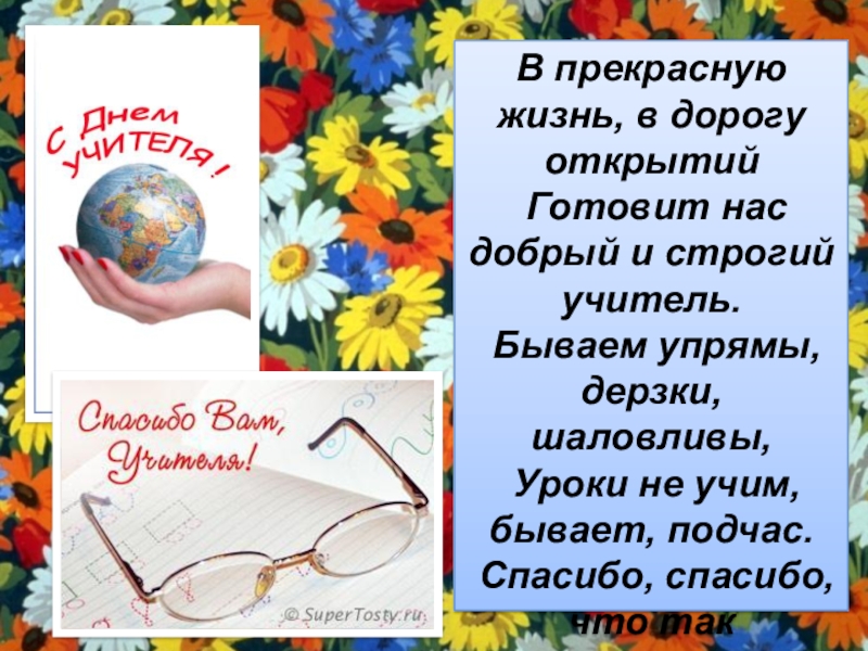 В прекрасную жизнь, в дорогу открытий Готовит нас добрый и строгий учитель. Бываем упрямы, дерзки, шаловливы, Уроки