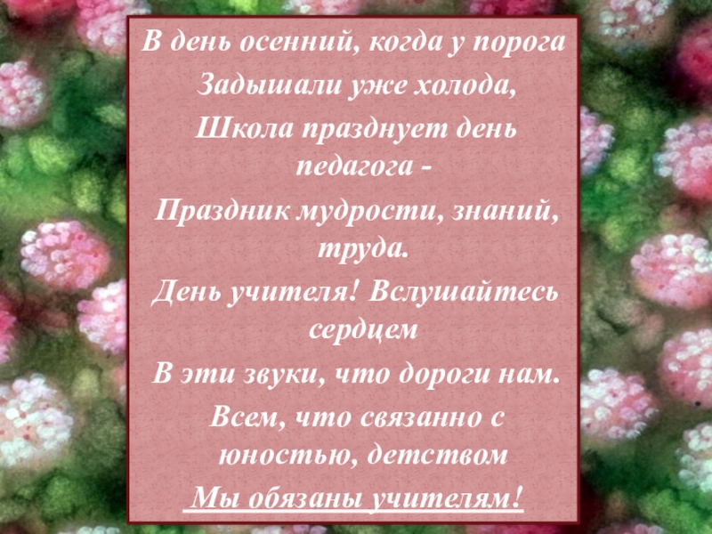 В день осенний, когда у порога Задышали уже холода, Школа празднует день педагога - Праздник мудрости, знаний,