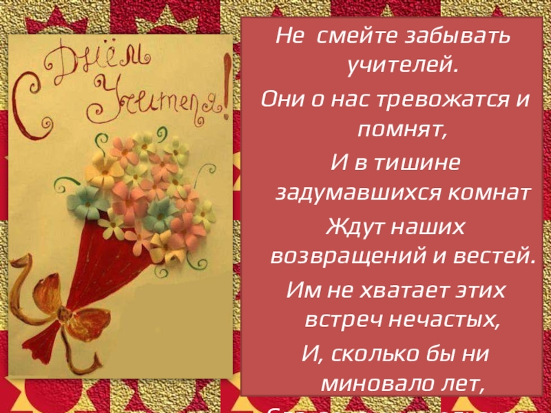 Не смейте забывать учителей. Они о нас тревожатся и помнят, И в тишине задумавшихся комнат Ждут наших