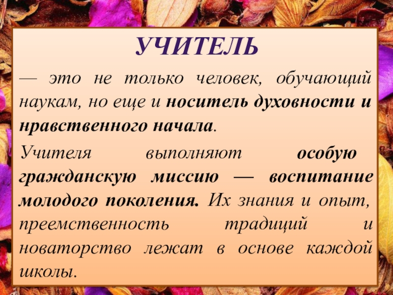 Учитель — это не только человек, обучающий наукам, но еще и носитель духовности и нравственного начала. Учителя выполняют особую гражданскую миссию — воспитание молодого поколения. Их знания и опыт, преемственность традиций и новаторство лежат в основе