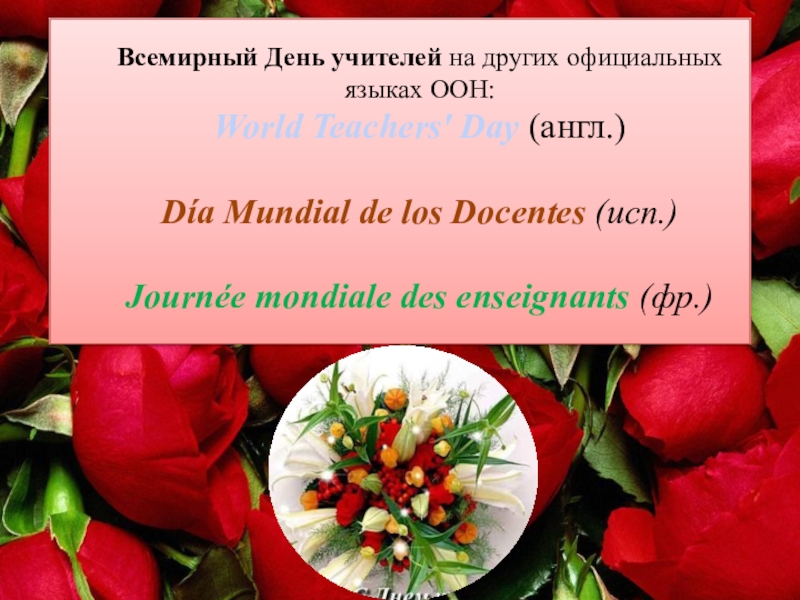 Слайд 4 Всемирный День учителей на других официальных языках ООН: World Teachers' Day (англ.) Día Mundial