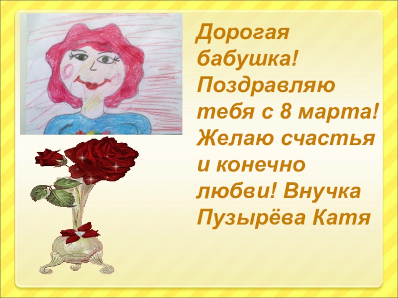 Слайд 47Дорогая бабушка! Поздравляю тебя с 8 марта! Желаю счастья и конечно