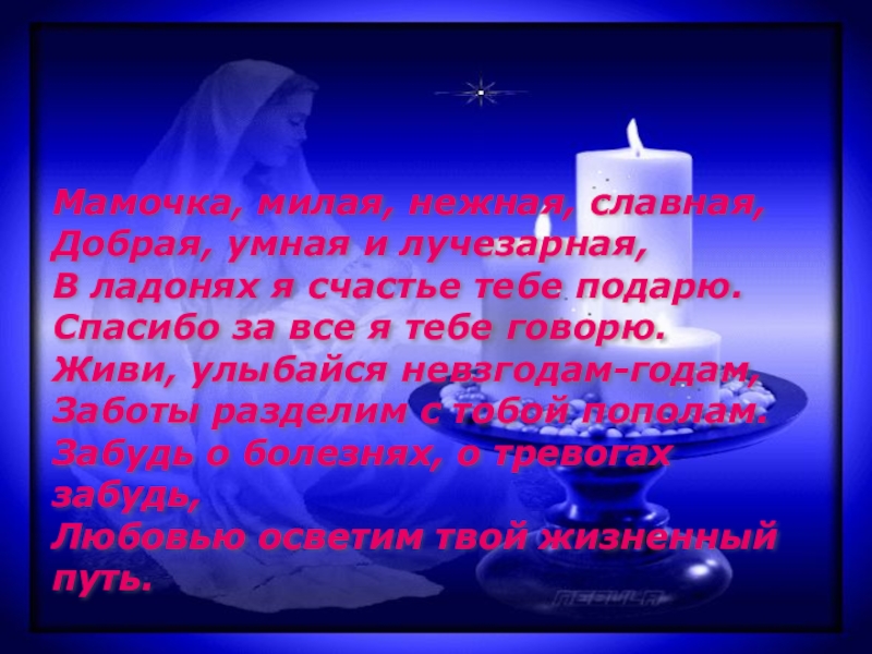 Слайд 6Мамочка, милая, нежная, славная, Добрая, умная и лучезарная, В ладонях я счастье тебе