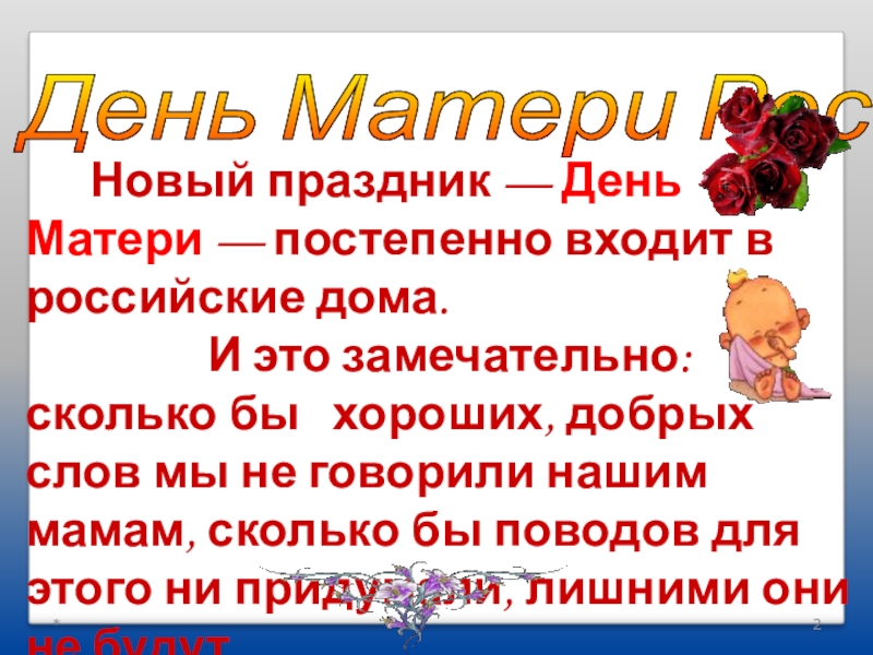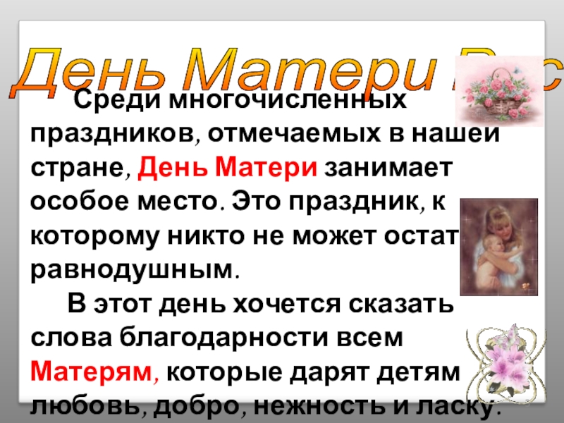 * День Матери России.    Среди многочисленных праздников, отмечаемых в нашей стране, День Матери занимает