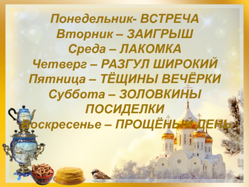 Понедельник- ВСТРЕЧАВторник – ЗАИГРЫШСреда – ЛАКОМКАЧетверг – РАЗГУЛ ШИРОКИЙПятница – ТЁЩИНЫ ВЕЧЁРКИСуббота – ЗОЛОВКИНЫ ПОСИДЕЛКИ Воскресенье – ПРОЩЁНЫЙ ДЕНЬ