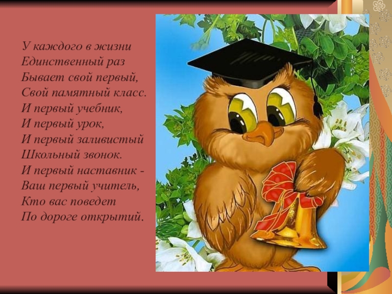 У каждого в жизни    Единственный раз    Бывает свой первый,    Свой памятный класс.    И первый учебник,    И первый урок,    И первый заливистый    Школьный звонок.    И первый наставник
