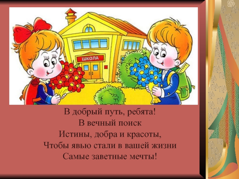 Слайд 19В добрый путь, ребята! В вечный поиск Истины, добра и красоты, Чтобы явью стали