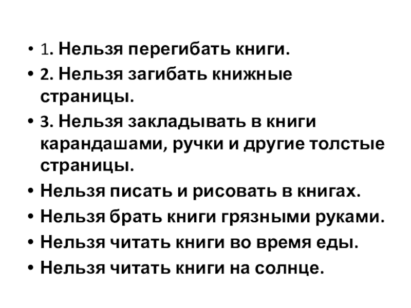 1. Нельзя перегибать книги.2. Нельзя загибать книжные страницы.3. Нельзя закладывать в книги карандашами, ручки и другие толстые