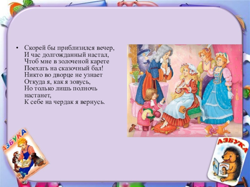 на сказочный бал! Никто во дворце не узнает Откуда я, как я зовусь, Но только лишь полночь настанет, К себе на чердак я вернусь.