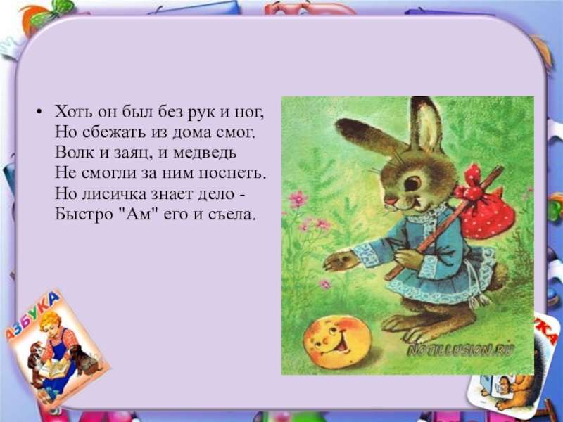 Хоть он был без рук и ног, Но сбежать из дома смог. Волк и заяц, и медведь