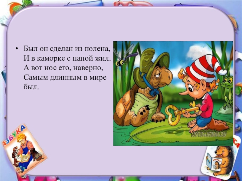 Был он сделан из полена, И в каморке с папой жил. А вот нос его, наверно, Самым