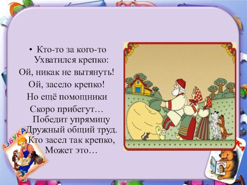 Кто-то за кого-то Ухватился крепко: Ой, никак не вытянуть!Ой, засело крепко! Но ещё помощники Скоро прибегут… Победит