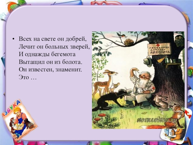 Всех на свете он добрей, Лечит он больных зверей, И однажды бегемота Вытащил он
