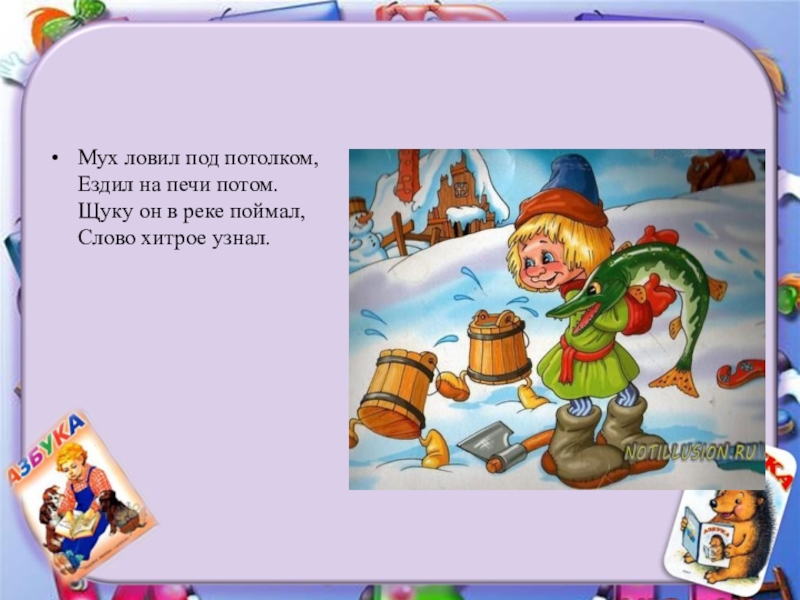 Мух ловил под потолком, Ездил на печи потом. Щуку он в реке поймал, Слово хитрое узнал.