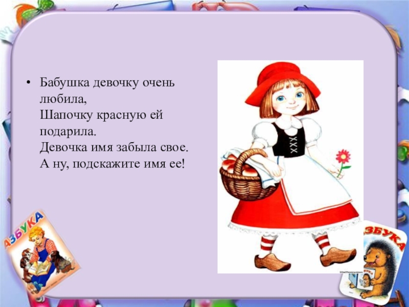 Бабушка девочку очень любила,  Шапочку красную ей подарила.  Девочка имя забыла свое.  А ну,