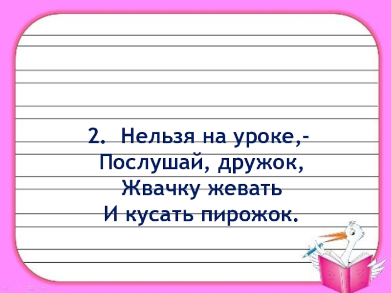 2.  Нельзя на уроке,- Послушай, дружок, Жвачку жевать И кусать пирожок.