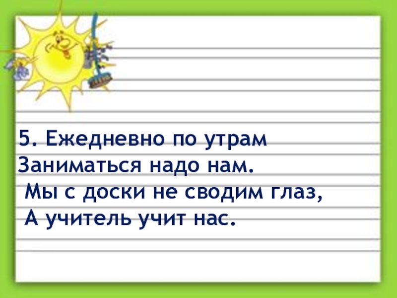 5. Ежедневно по утрамЗаниматься надо нам. Мы с доски не сводим глаз, А учитель учит нас.