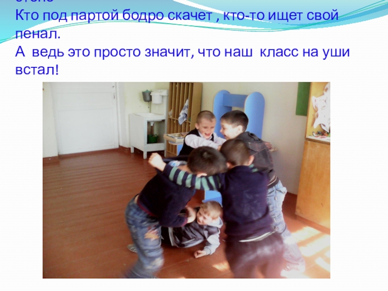 кто скатился по стене Кто под партой бодро скачет , кто-то ищет свой пенал. А ведь это просто значит, что наш класс на уши встал!