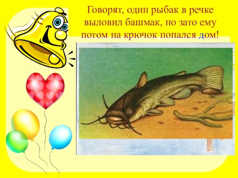 Слайд 13Говорят, один рыбак в речке выловил башмак, но зато ему потом