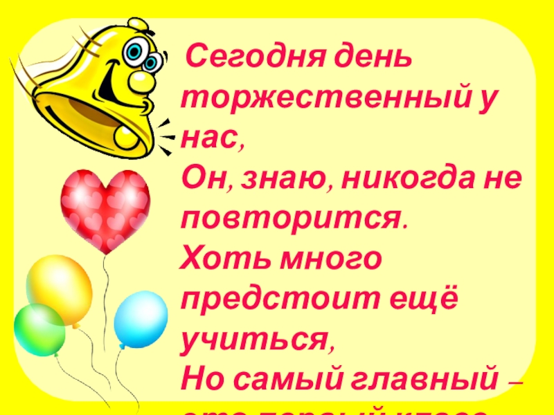 Сегодня день торжественный у нас, Он, знаю, никогда не повторится. Хоть много предстоит ещё учиться, Но самый главный – это первый класс.