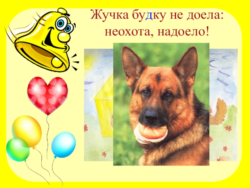 Слайд 16Жучка будку не доела: неохота, надоело!