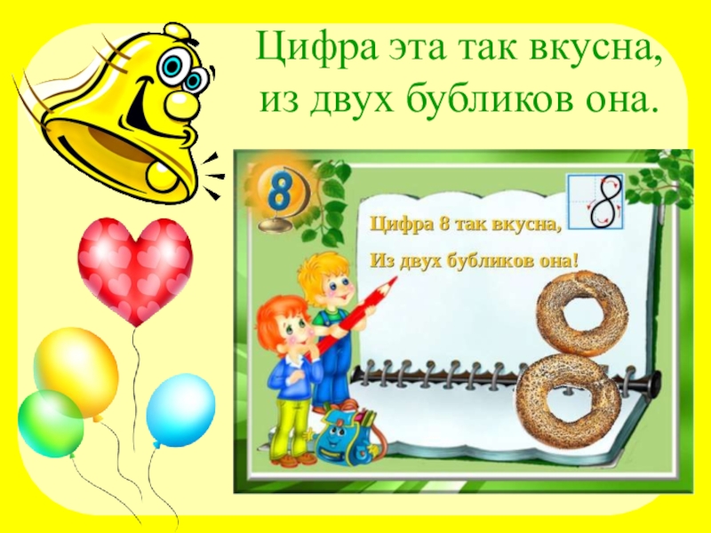 Слайд 25Цифра эта так вкусна, из двух бубликов она.