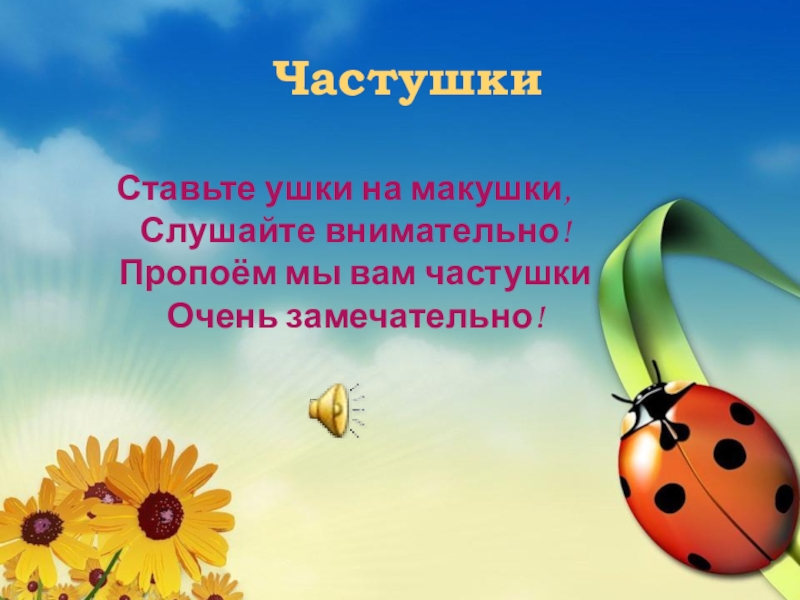 ЧастушкиСтавьте ушки на макушки,  Слушайте внимательно!  Пропоём мы вам частушки  Очень замечательно!