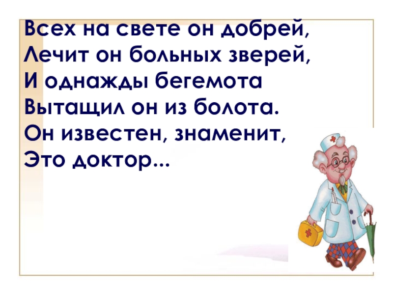 Всех на свете он добрей, Лечит он больных зверей,И однажды бегемотаВытащил он из болота.Он известен, знаменит,Это доктор...