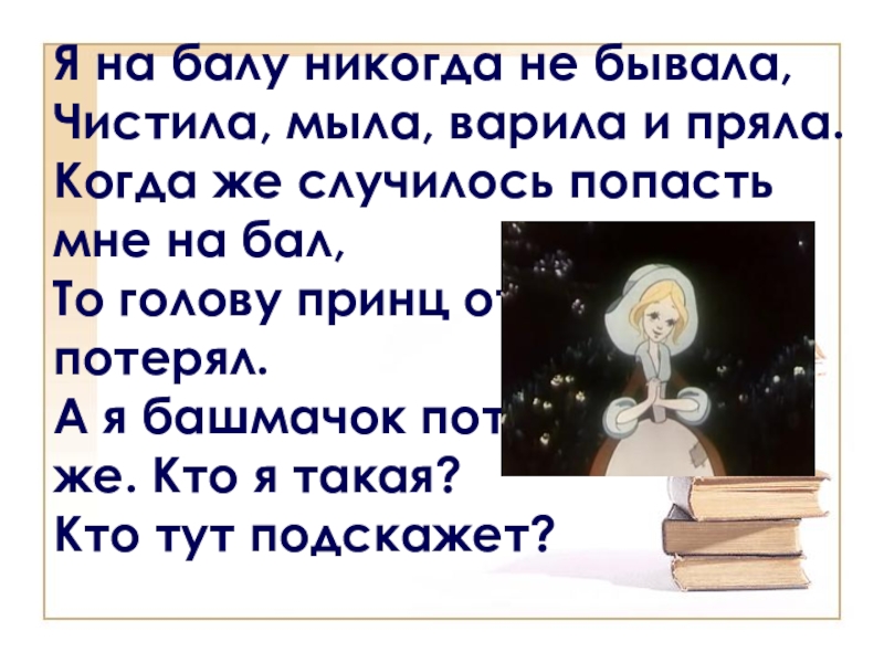 А я башмачок потеряла тогда же. Кто я такая?