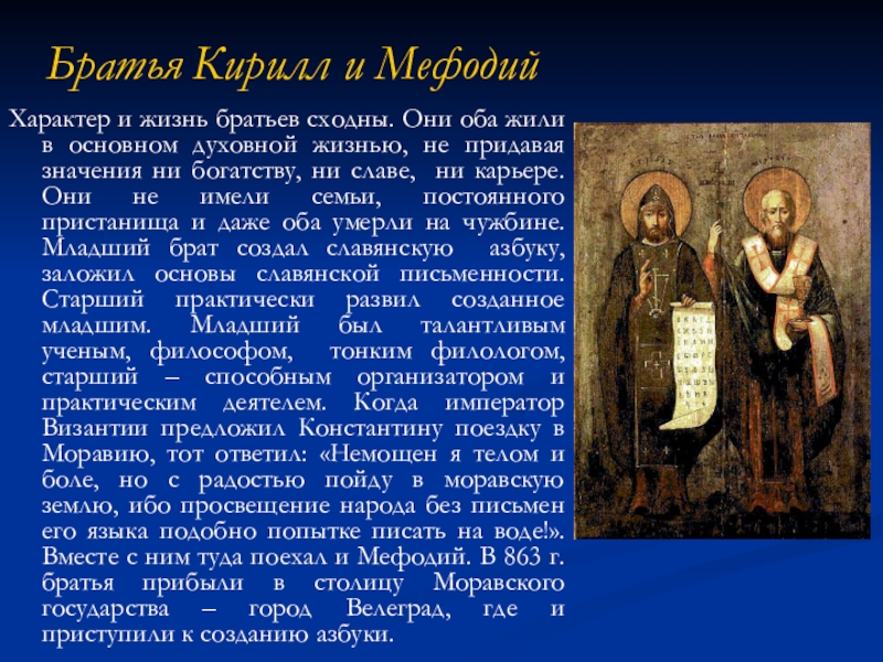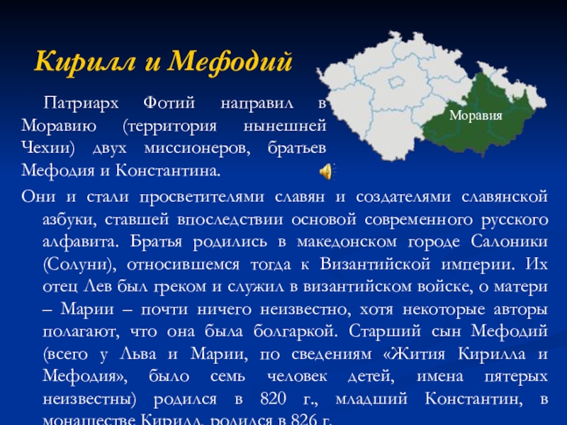 Патриарх Фотий направил в Моравию (территория нынешней Чехии) двух миссионеров, братьев Мефодия и Константина.