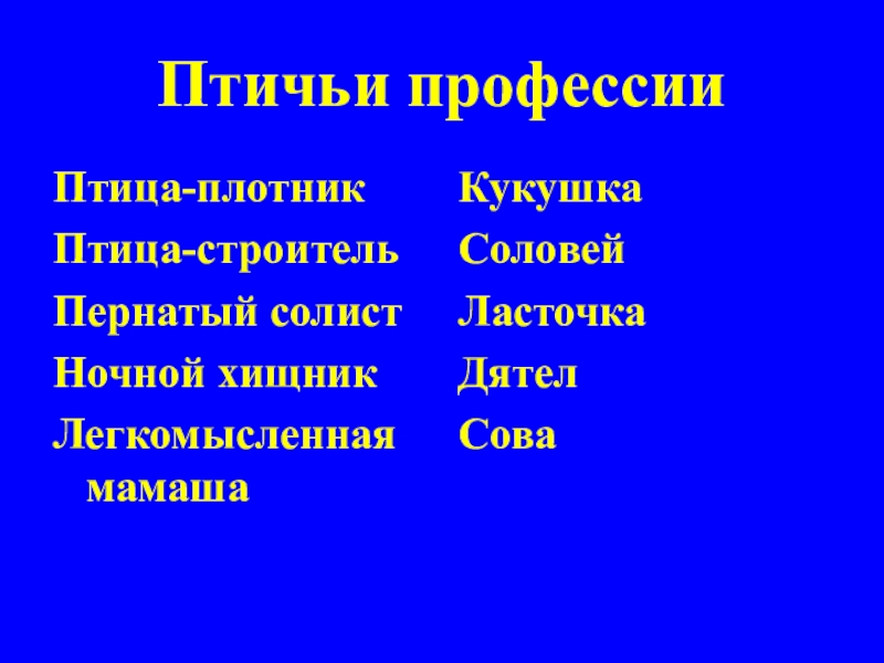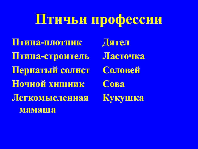 Птичьи профессииПтица-плотникПтица-строительПернатый солистНочной хищникЛегкомысленная мамашаКукушкаСоловей Ласточка Дятел Сова