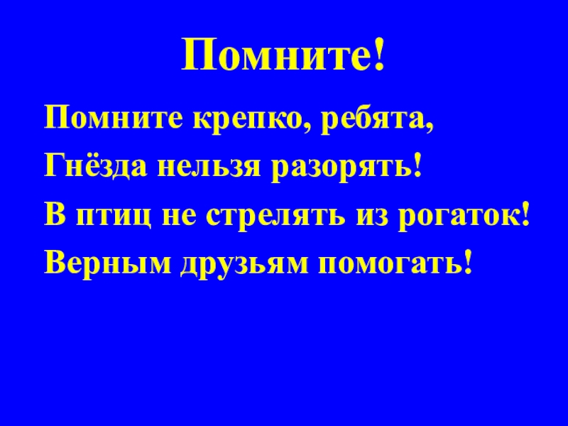 Помните!Помните крепко, ребята,Гнёзда нельзя разорять!В птиц не стрелять из рогаток!Верным друзьям помогать!