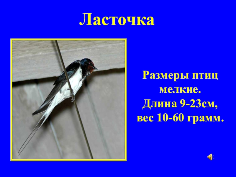 ЛасточкаРазмеры птиц мелкие.  Длина 9-23см,  вес 10-60 грамм.