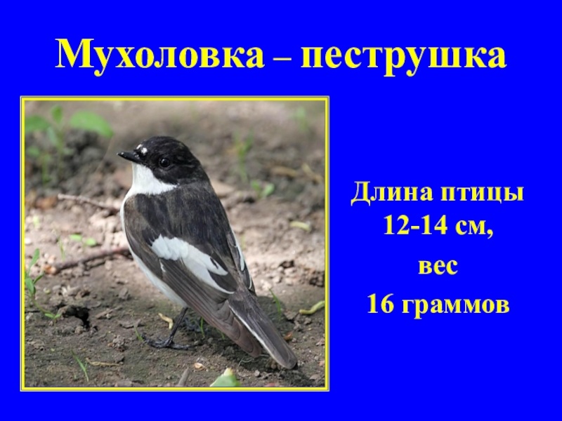Мухоловка – пеструшкаДлина птицы 12-14 см, вес 16 граммов